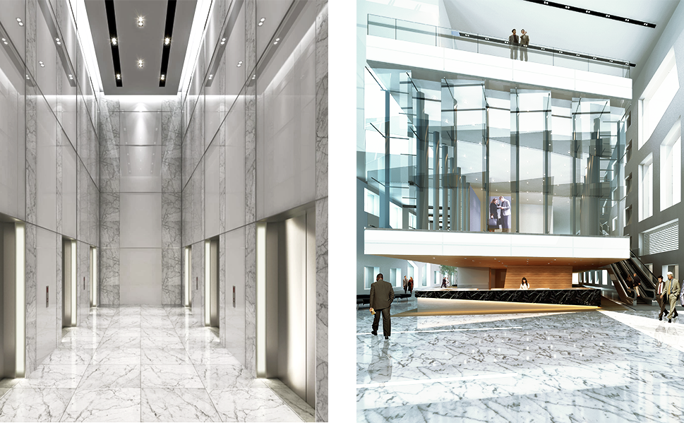 Approach: The design of the interior curtain Wall is derived from a sediment stone rock. It reflects the “vertical city”, different Layers and utilization of the Building that rises from a strong base. Several woven like bands in a alternating rythm create a strong statement. The lobby spans over three storeys. The spaciousnes was used in a way that reflects rationalism. White as dominating color emphasizes the detailed forms and interior elements. May one find him self reminded on a laboratory before the depict minimalism and detailing of the interior unfolds it’s virtue. To create a spine between interior and exterior, the irregular forms of the exterior facade where taken as inspiration for the window design of the mezzanine space.