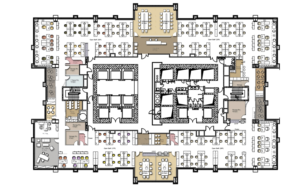 RFP: “Colliers is seeking a working environment and office interior that is clean, spacious, practicable and functional, and promotes teamwork and calibration. The image should be creative and reflect the nature of the business. The use of natural light is preferred, and the interiors should feel open, clean and spacious, while minimising noise. The design of the new premises should also consider the LEED, an energy-saving and environmentally friendly approach..”.