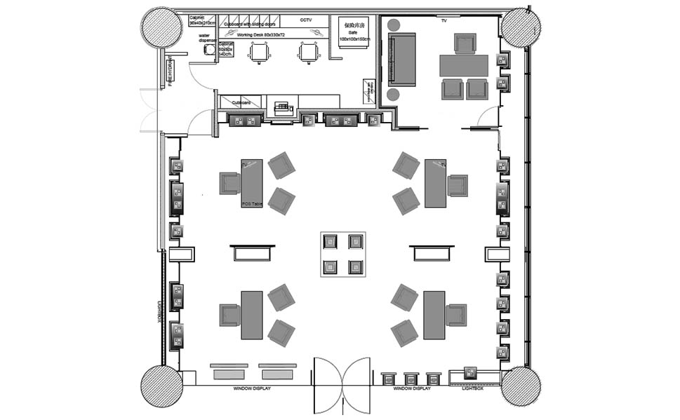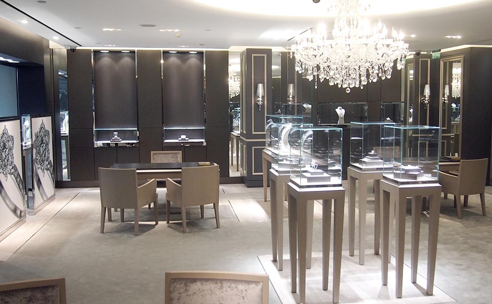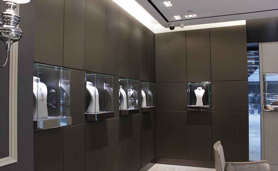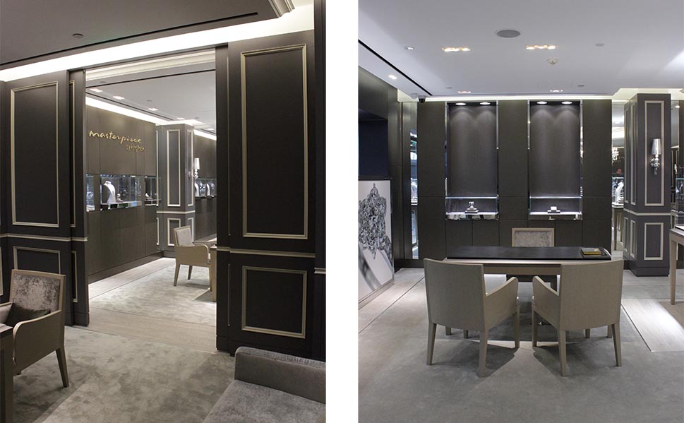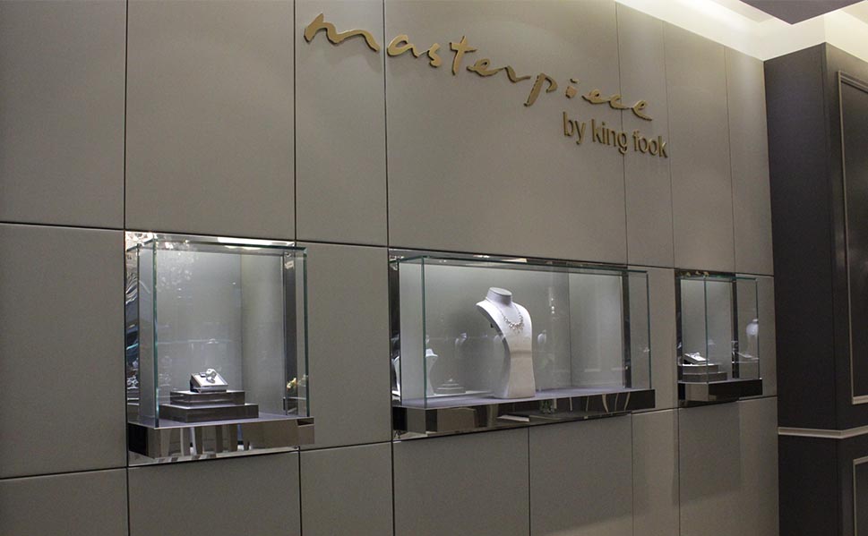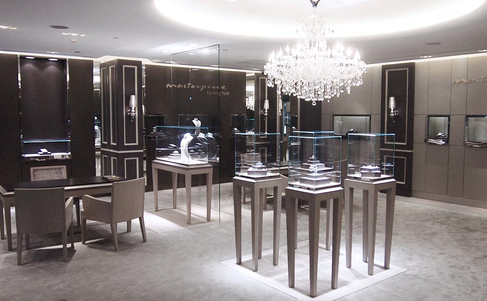 The concept blends historical gestures with eclectic nots. Color, saturation, texture, light and line are orchestrated in a way, that they serves as a basis of expressing elegance and to tell the story of Kingfook. Accentuating moulded panelings and Furnitures are aranged in a way, that they order the Displays and Layout. The wall design has clean lines and a rythm that borders the Displays perfectly while underlining the beauty of the jewelery. Each of the displays is designed to cater one collection which can be viewed in a compfortable way through different eye levels. The color palette ranges from pastel to natural tones. Soft Materials such as silk, velvet, and shiny fabric for the Wallcovering correspond with the wooden Paneling and oak flooring. The interplay of minimalism and mid century notes, keep each other in balance and create a contemporary and fashionable appearance with a touch of traditional elegance